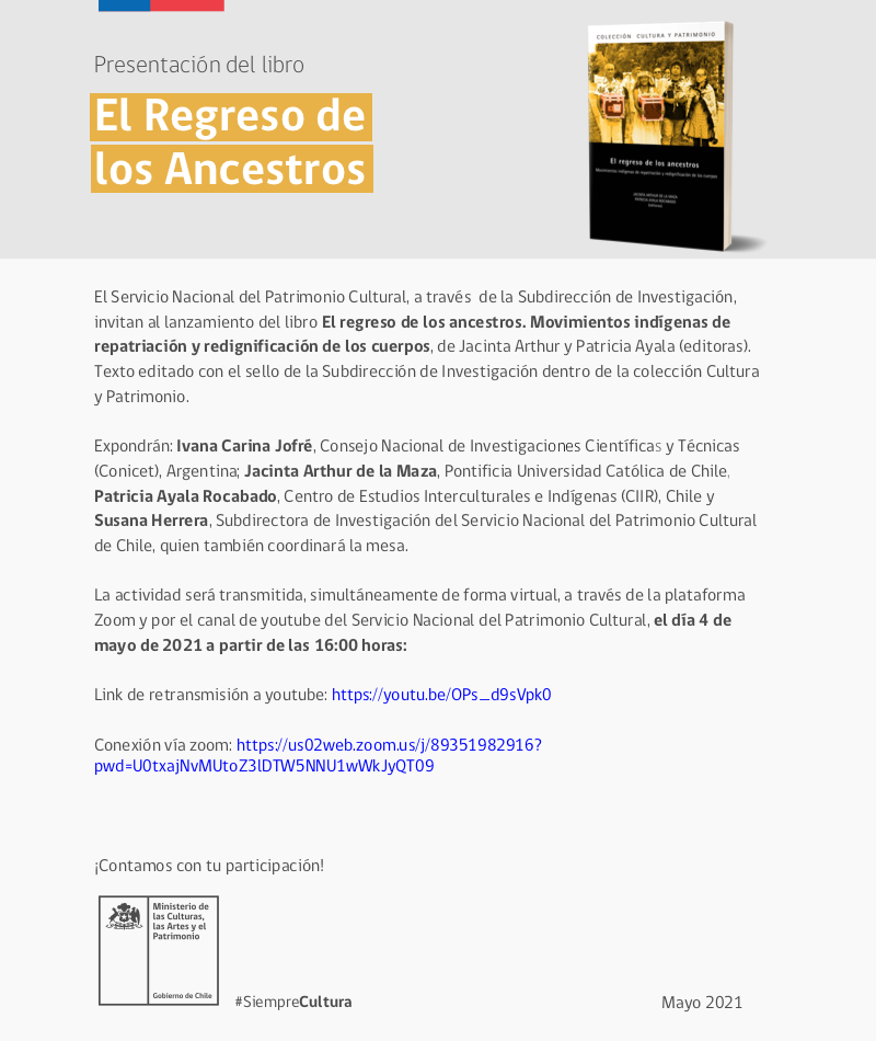 El Servicio Nacional del Patrimonio Cultural, a través de la Subdirección de Investigación, invitan al lanzamiento del libro El regreso de los ancestros. Movimientos indígenas de repatriación y redignificación de los cuerpos, de Jacinta Arthur y Patricia Ayala (editoras). Texto editado con el sello de la Subdirección de Investigación dentro de la colección Cultura y Patrimonio.